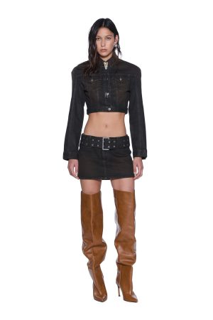 The Define Tucker Greased is a fashion-forward slim-line trucker jacket with a cropped waist. elongated sleeves. and structured shoulders for a bold silhouette. Made from premium comfort stretch indigo-black waxed denim with a brown. worn-in rusted finish. it features classic trucker paneling and is finished with anti-brass Ksubi-branded hardware. T-box. and 3×4 embroidery. Pair with the Soho Lo Belted Greased for a directional head-to-toe look.