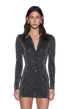 The Devin LS Shirtdress Silver is a slim-fit. sheer. button-through shirt dress with a classic collar. full-length sleeves. and cuff detailing. Crafted from a premium lightweight knitted lurex fabrication for a subtle shimmer. it features anti-silver buttons. a Ksubi SOTT woven label. and signature T-box embroidery. designed to wear as a sleek standalone dress or layered half-buttoned over denim.