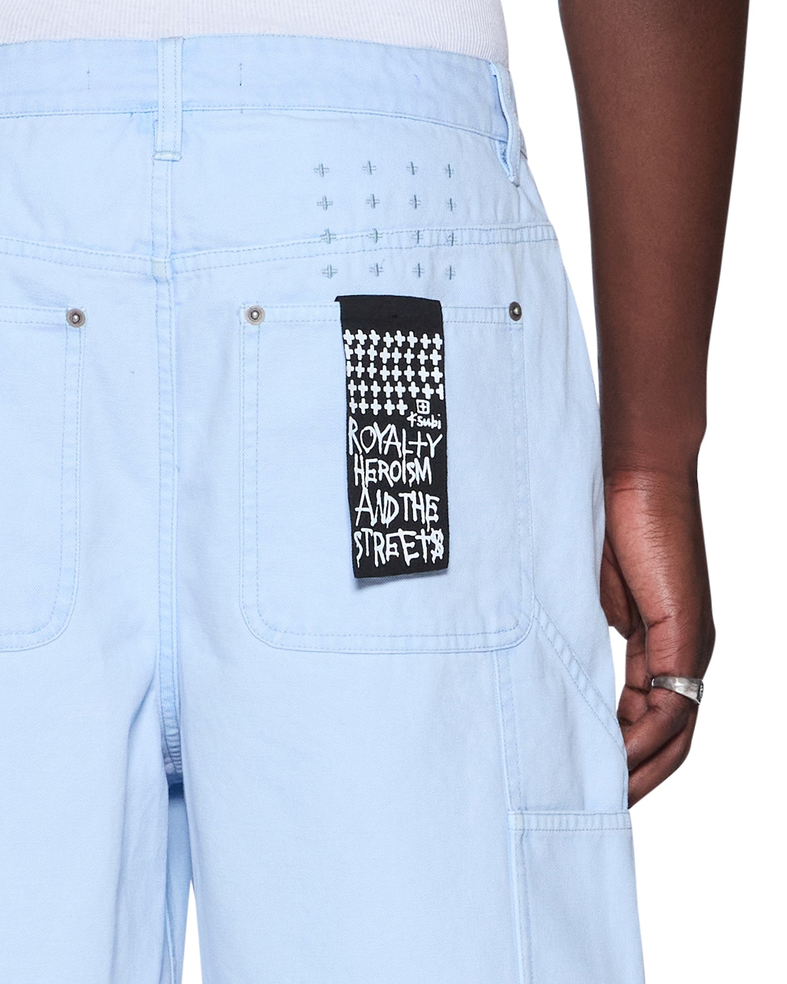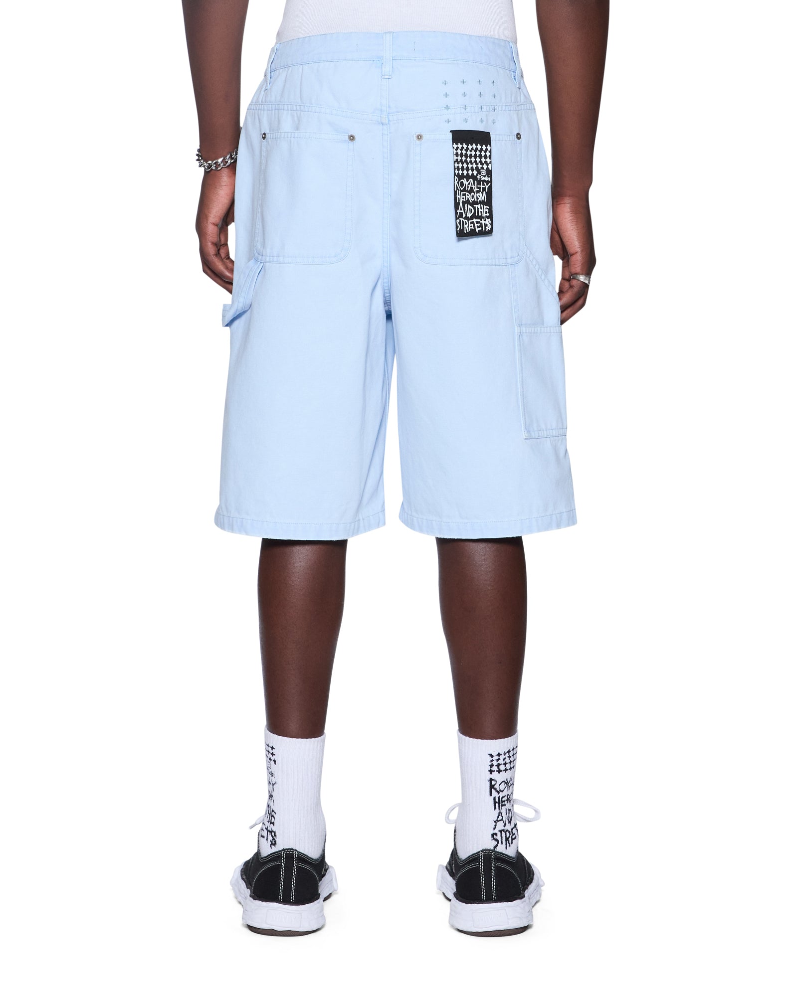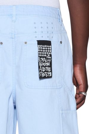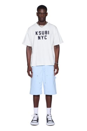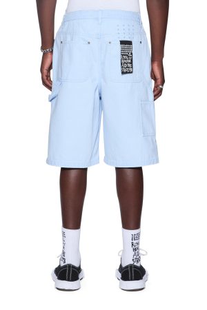 The Drill Maxx Operator Short Sky Blue is an exaggerated wide-leg jean short designed with a long rise and crafted from premium sky blue drill fabric with a stone wash finish. The style features carpenter panels. a right leg carpenter pocket tab. cut-away front pockets. back patch pockets. and signature t-box and 4×4 embroidery with Ksubi branded hardware for a premium utility-inspired finish.