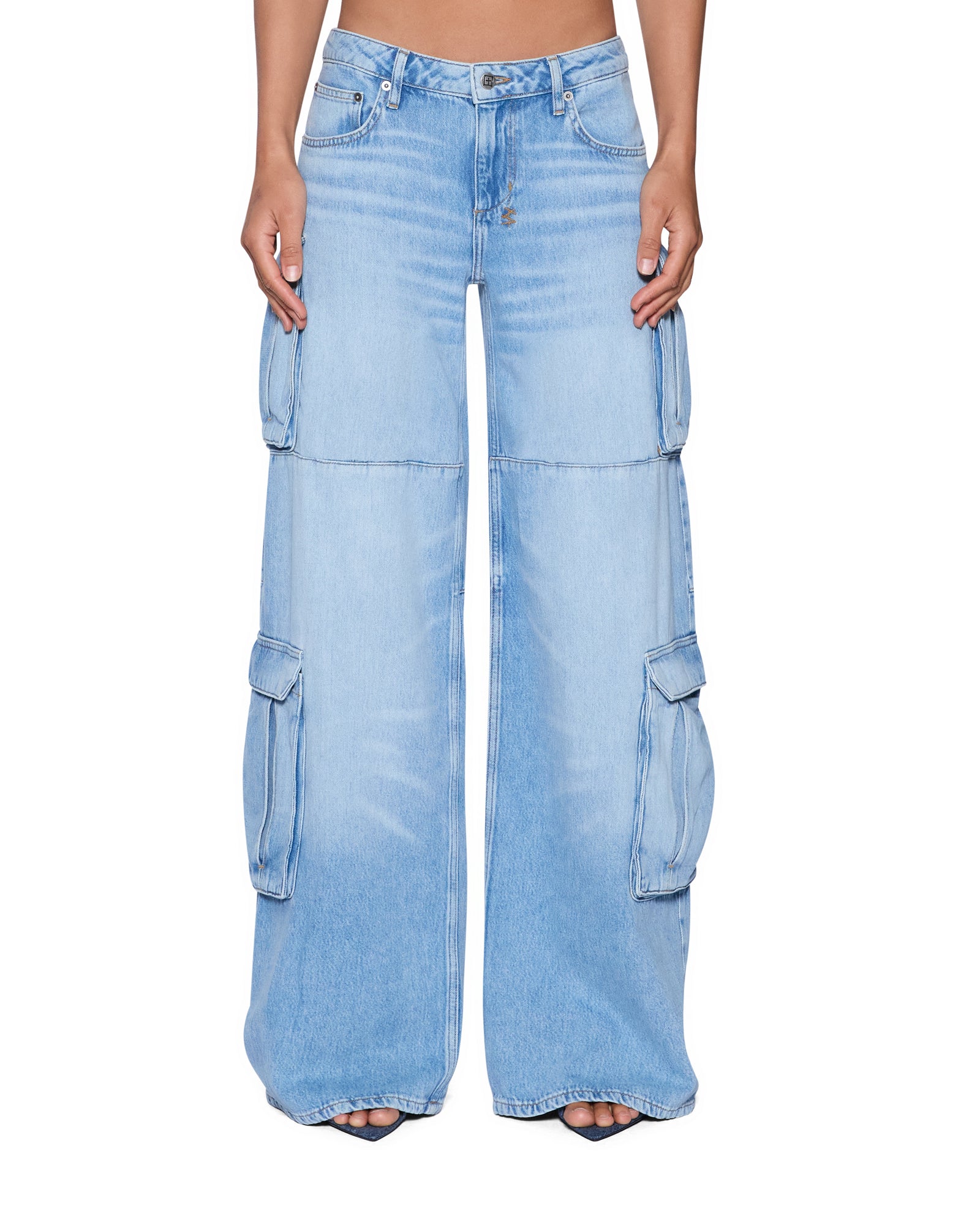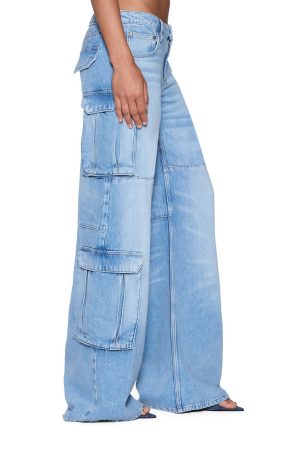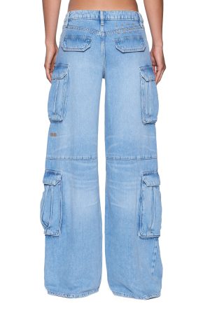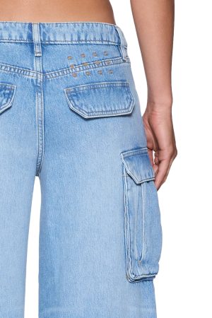 The Dropout jean Cargo Spirit is a low-rise. short-crotch silhouette with a baggy wide leg. Made from lightweight cotton tencel denim with a vintage worn-in light blue wash with extreme soft feather handfeel. with subtle grinding for an authentic worn-in finish. Featuring side facing 3D cargo pockets. complete with five-pocket styling. Ksubi hardware. signature T-box and 3×4 embroidery embroidery. and a removable pocket tag at the right back pocket.