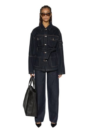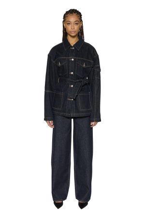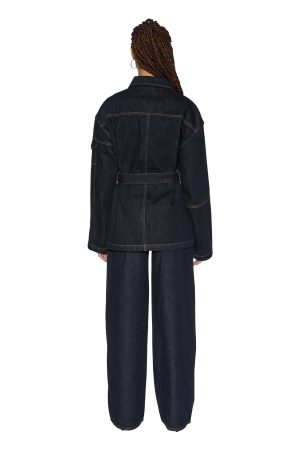 The Duty Jacket Zenith Pop is an oversized fit longline trucker jacket with a button closure. dropped shoulders. front trucker panel detail. patch pockets. and a removable belt. Made from premium dark indigo denim with a rinse wash and contrast stitching. it features T-box and 3×4 back cross embroidery. finished with branded anti-silver hardware. Style it with the matching Hera Mini Skirt Zenith Pop for a coordinated denim look.