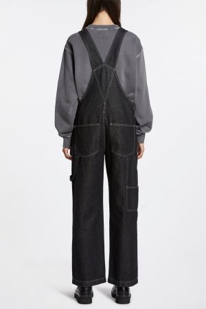 Relaxed fit overall adjustable shoulder straps. wide straight legs and full length. Has faux front fly topstitch details and tack button closures on both sides. Made from a premium European rigid denim in raw black. It features contrast topstitching and Ksubi branding.