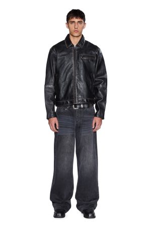 Eldorado Leather Jacket Black is a boxy. regular-length zip-through leather jacket featuring a classic collar. zip-up welt pockets. and a chest pocket. Made from heavyweight cow leather with authentic ageing treatments. it is finished with signature metal T-box branding for a bold. timeless edge.