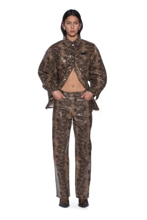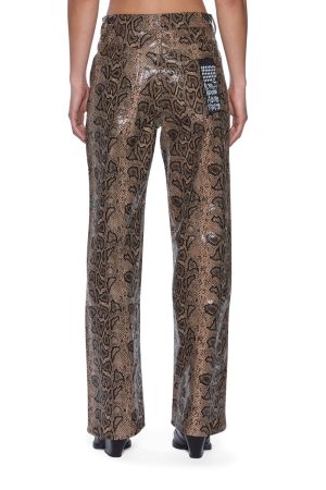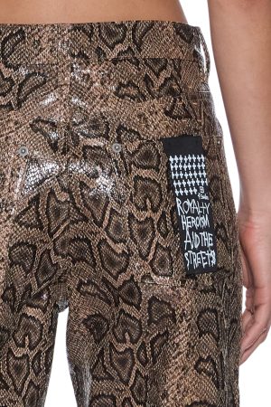 The Empire Pant Snakebite is a relaxed straight-leg style with a true mid-rise and regular-length fit. crafted from printed snakeskin faux leather. Featuring classic five-pocket styling. anti-silver Ksubi branded hardware. T-box and 3×4 embroidery. and a removable pocket tag attached to the wearer’s right back pocket.