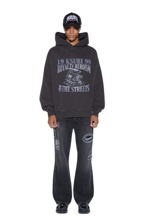 The Engine Ekcess Hoodie Faded Black is a boxy oversized fit hoodie with a single-piece hood. front pouch pocket. and signature rats tail detail. Made from premium loopback fleece in the Faded Black colourway. it features seasonal printed artwork at the front crest and back. finished with tonal T-box and 4×4 embroidery branding.