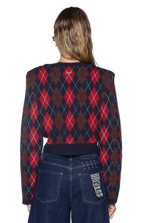The Fable Cardi Red Argyle is a cropped zip through cardigan crafted from a premium wool blend in a double jacquard knit. featuring a seasonal argyle pattern. Designed with a fitted silhouette and a crew neckline. it is finished with ribbed neckline. cuffs and hem. and a double ended heavyweight shiny silver Ksubi zip closure.