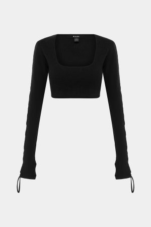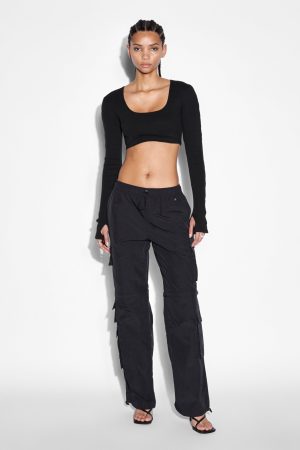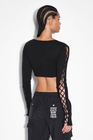 The Fantasy Top Black is a super-cropped top. with long slim sleeves. cut-outs and tonal black lace up detailing. Made from a premium cotton blend rib in a jet black colourway. this style features a scoop front neckline. Ksubi branding and thumb holes. Designed to be worn super cropped with low-rise jeans or styled back with the Tactic Cargo Pant Black.