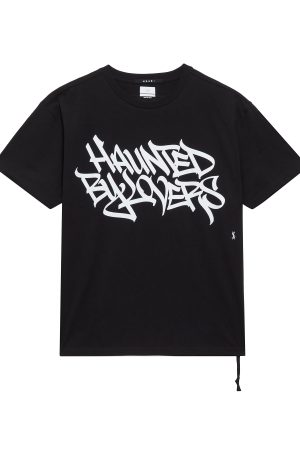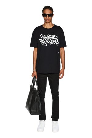 The Faust Biggie SS Tee Jet Black is an oversized fit featured in a black colourway. Constructed from a premium cotton open ended jersey. the tee is garment dyed and finished with an aged wash. This style features a printed Haunted By Lovers graphic in Faust’s signature font across the front chest. Faust’s tag on the center back neckline. the original Ksubi oversized back 4×4 cross print. raw back hem detail. front cross dollar embroidery. reverse overlocked side seams. signature rats tail and Ksubi t-box printed branding.