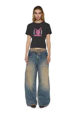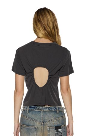 The Funny Bunny Shrunken Ss Tee Washed Black is a relaxed mini tee featuring a crew neck. short sleeves. Crafted from premium cotton jersey in a ‘Washed Black’ colorway. it showcases an exclusive Ksubi seasonal parody graphic inspired by the iconic 80s rock band ‘Sonic Youth.’ Design details include a circular cutout at the back with a ruched elastic bungee cord for adjustable styling. finished with signature T-box embroidery. Style back with Ksuper Dune.