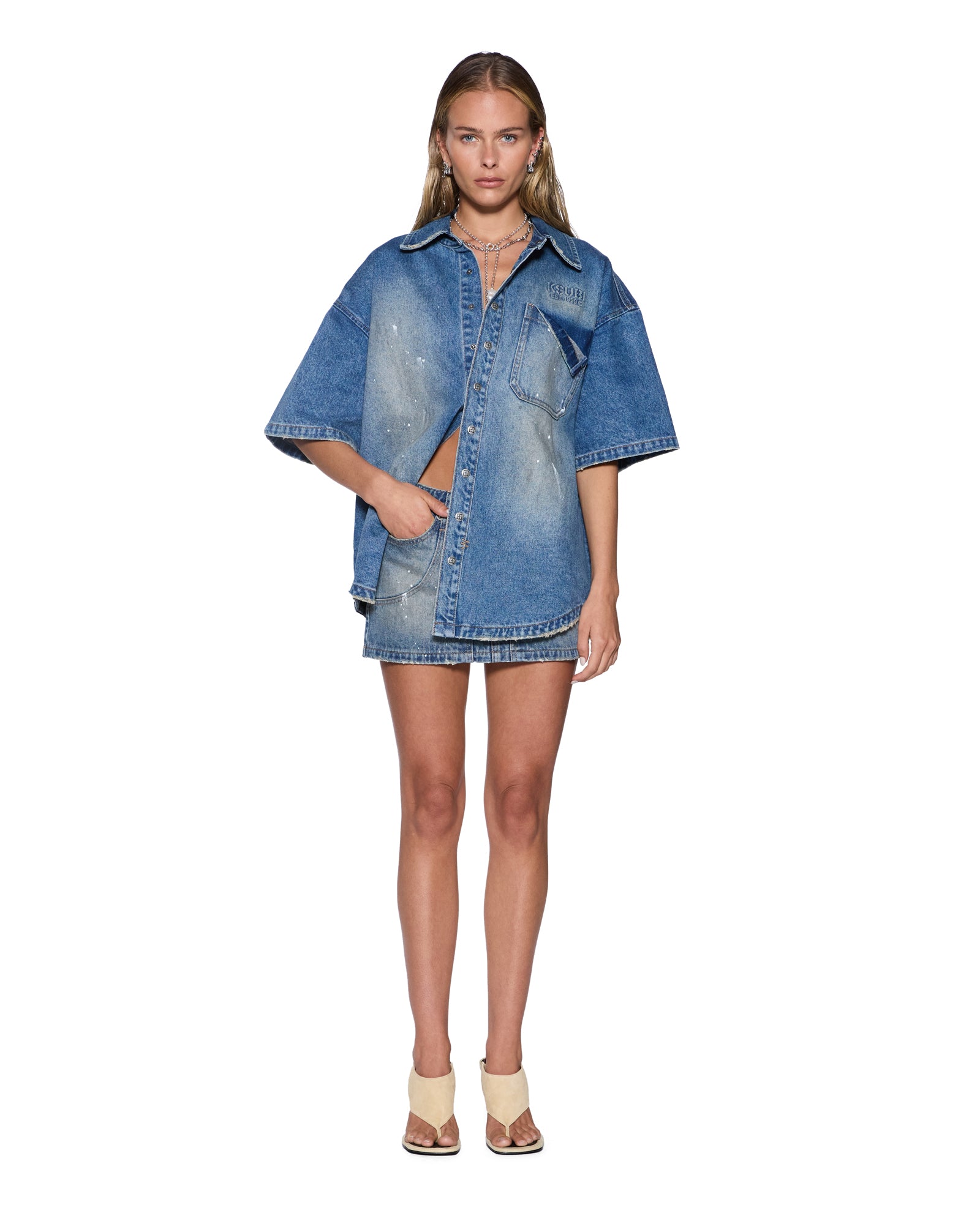 The Garage Denim Short Sleeve Shirt Painter Blue is an oversized short-sleeve button-through shirt with a curved hem. crafted from premium rigid indigo denim in a mid-blue wash with a warm tint and high-wear contrast detailing. The shirt features subtle grinding at the collar and hem. a tear-away patch chest pocket. seasonal Ksubi stencil embossing above the pocket. and is finished with branded hardware. signature T-box embroidery. and 3×4 cross embroidery.