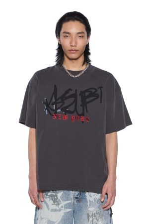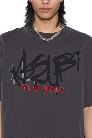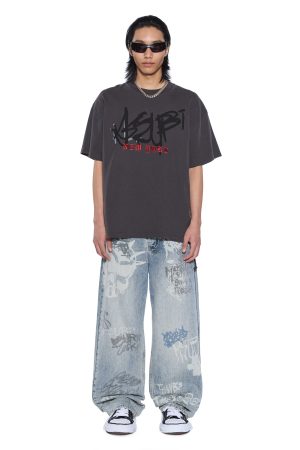 The Graff Ekcess Short Sleeve Tee Old Black is an oversized-fit tee with a raw-cut back hem. reverse overlocked side seams. and signature rats tail. Made from European cotton jersey in garment-dyed black with a heavy ombre wash. it features seasonal Graff artwork applied in multiple executions and is finished with signature T-box and 4×4 branding.
