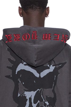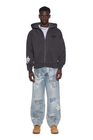 The Graff Ekcess Zip Thru Hoodie Faded Black is a boxy. oversized-fit hoodie with a single-piece hood. zip-through front closure. front pouch pocket. and rats tail detail. Made from loopback fleece in garment-dyed faded black with an aged wash. it features seasonal screen prints up the sleeve and hood embroidery. finished with T-box and 4×4 embroidery branding.