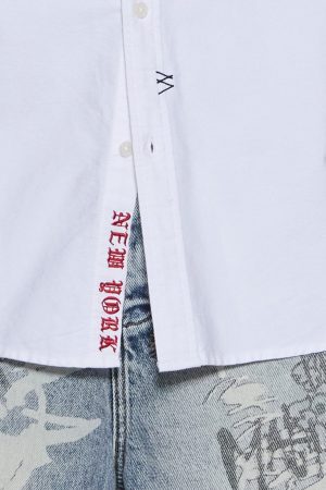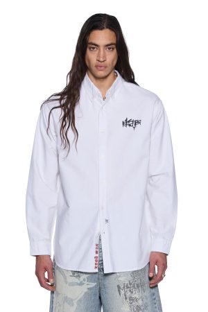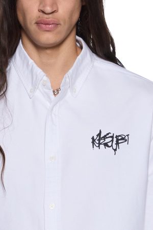 The Graffiti Anti Button Down LS Shirt White is a relaxed-fitting long sleeve button-down shirt with a button-down collar and scooped hem. Cut from midweight premium cotton oxford shirting in white. it features seasonal graffiti artwork printed on the front and back. and is finished with T-box and 4×4 embroidery and Ksubi branded hardware.