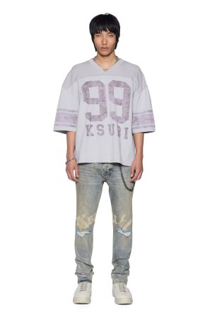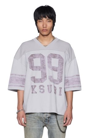 The Halftime Ss Duke Jersey Krete Fade is a boxy oversized fitting. waist-finishing length tee with an exaggerated shoulder drop. reverse overlocked side seam and signature rats tail. Featuring a v-neck opening. it is made from heavyweight cotton jersey and tonal mesh in washed grey. It includes printed artwork on the front and back and is finished with signature t-box and 4×4 branding.