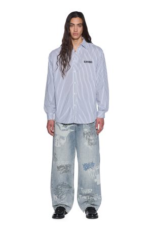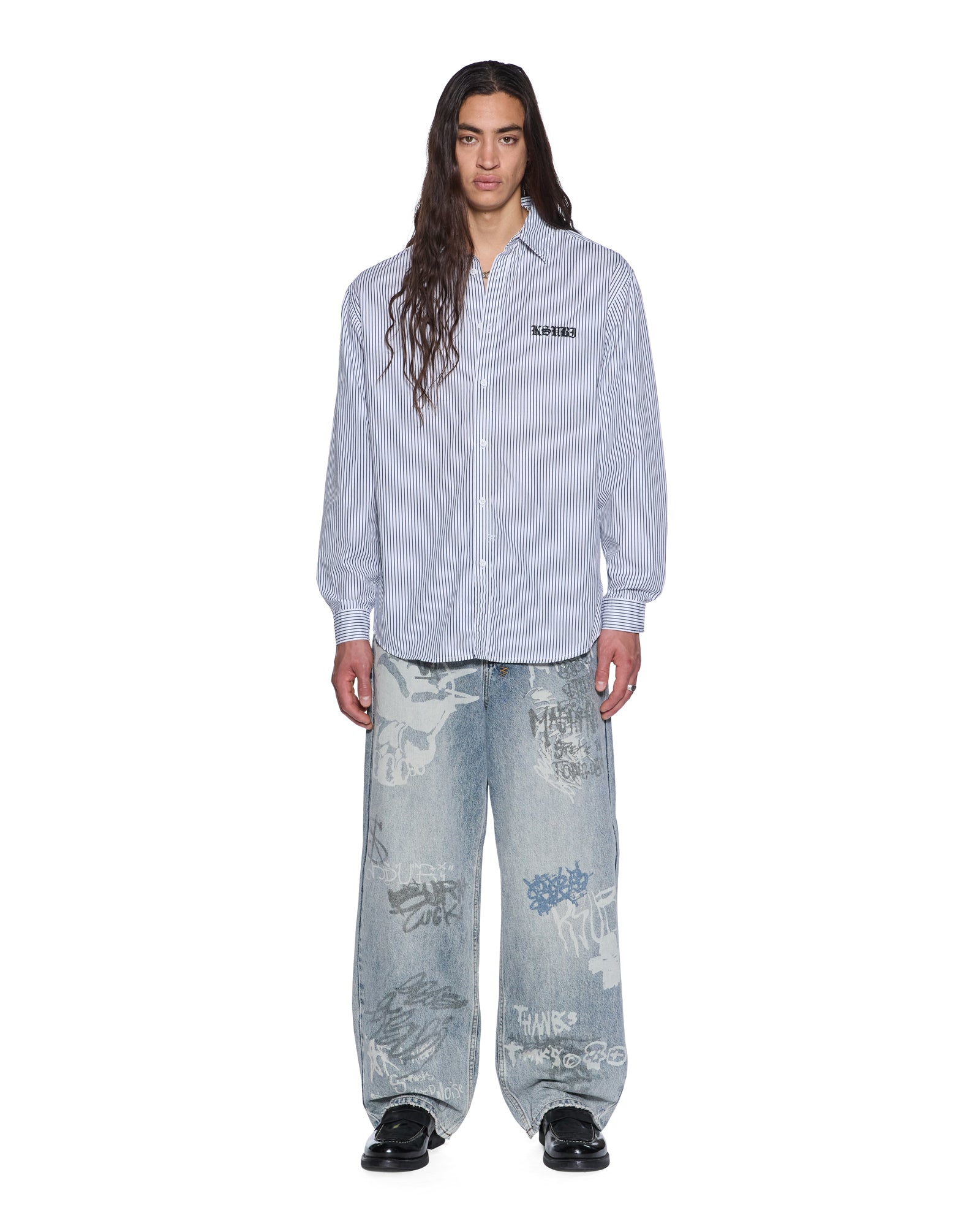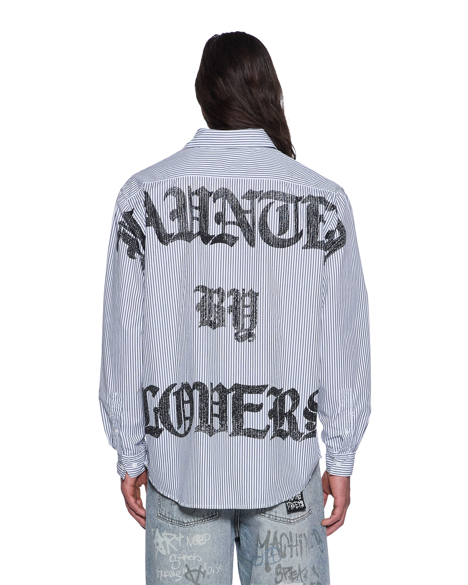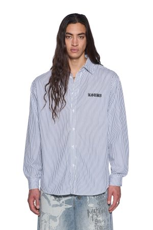 The Haunted KSignature Long Sleeve Shirt Black Stripe is a relaxed-fit button-down with long sleeves. a button-down collar. and a scooped hem. Made from midweight premium cotton striped shirting in black and white. it features seasonal artwork printed on the front and back. finished with T-box and 4×4 embroidery and Ksubi hardware.