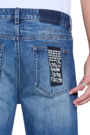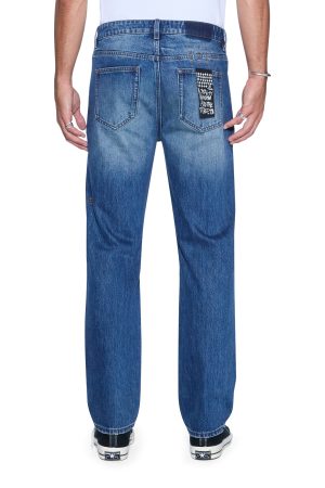The Hazlow Vintage Blue is a mid-rise relaxed straight leg jean with a regular leg opening. Made from premium rigid denim with vintage wash treatments replicating authentic ageing. it features ghost patching details. signature T-box and 4×4 embroidery. and Ksubi branded hardware.