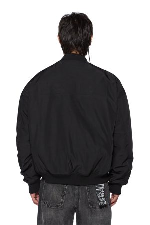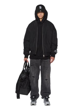 The Intruder Bomber Jacket in Faded Black is a relaxed. boxy fit classic bomber silhouette. Featuring a zip-through front closure. ribbed neckline. sleeve cuffs. and hem. The Ksubi T-box and back 4×4 cross embroidery add signature detail. while the branded hardware and woven sleeve tag complete the bold look. A perfect fusion of edgy and effortless. designed for ultimate comfort and style.