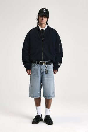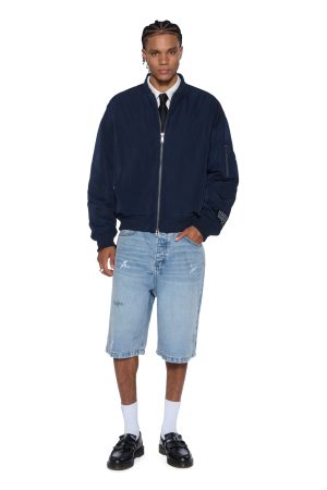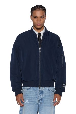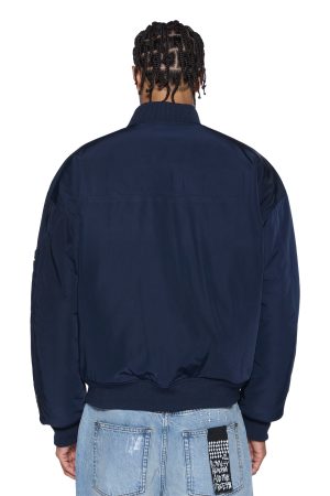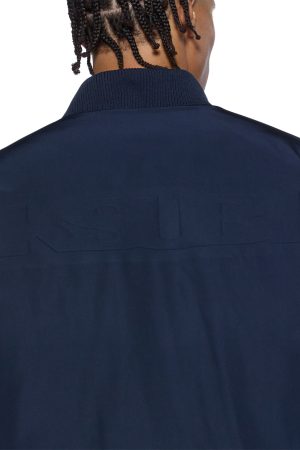 The Intruder Bomber Jacket Navy is an oversized padded bomber made from premium navy nylon. It features a classic sleeve pocket with branded metal plate. welt snap pockets. internal lining pocket. and zip-through closure. finished with debossed Sign of the Times logos and tonal T-box and 4×4 embroidery.
