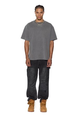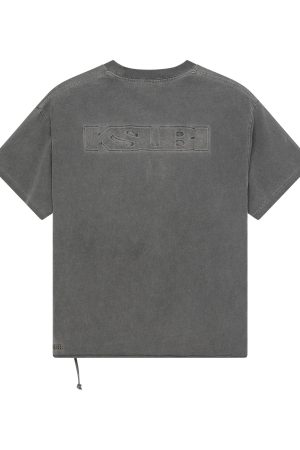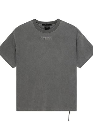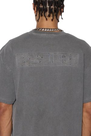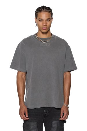 The Intruder Ekcess SS Tee Charcoal is a boxy oversized fitting short sleeve t-shirt with a dropped shoulder and raw cut back hem. Detailed with a reversed overlocked side seam. signature rats tail. and branded logos. it is made from a premium heavy weight cotton jersey in an overdyed charcoal grey with an aged wash. Featuring debossed sign of the times artwork at the front and back. it is finished with debossed t-box branding.