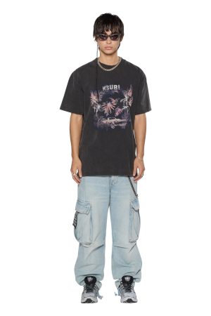 The Island Biggie SS Tee Faded Black is an oversized fit short sleeve t-shirt with raw-cut back hem. reverse overlocked side seam. and signature rats tail. Made from European cotton jersey in an overdyed faded black with an aged wash. it features cracked screen printed seasonal artwork at the front and is finished with signature t-box and 4×4 branding.