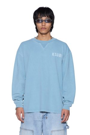 The K-Lock Ekcess LS Tee Summer Blue is an oversized long sleeve t-shirt with a raw-cut back hem. reverse overlocked side seams. triangle rib neck inset. and signature rats tail. Made from premium cotton jersey in a garment-dyed light blue. it features seasonal embroidery artwork on the front and back and is finished with signature T-box and 4×4 branding.