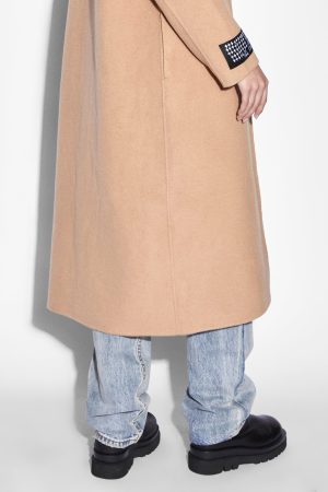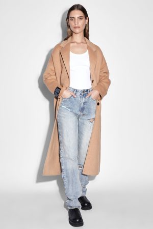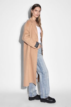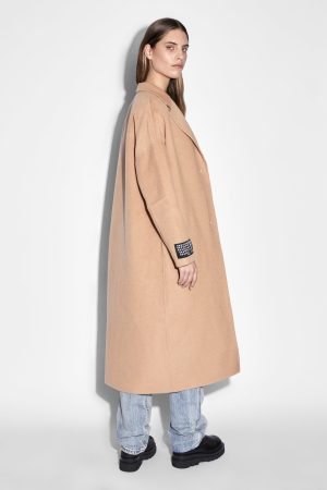 The Kamille Coat is a long line. relaxed fit coat in a latte colourway. This coat is unlined and features internal felled seams. made from a premium wool blend for a luxurious finish. Featuring branded front buttons. signature sleeve ksubi tag and Ksubi t-box embroidered branding on back hem.