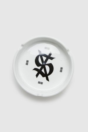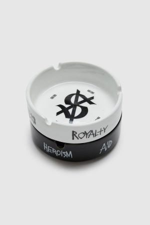 The Kash Tray White is a ceramic ashtray featuring the cross-dollar logo in the centre and 8 t-box symbols on the base. The Royalty. heroism and the streets text is printed around the outside.