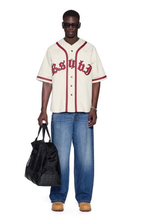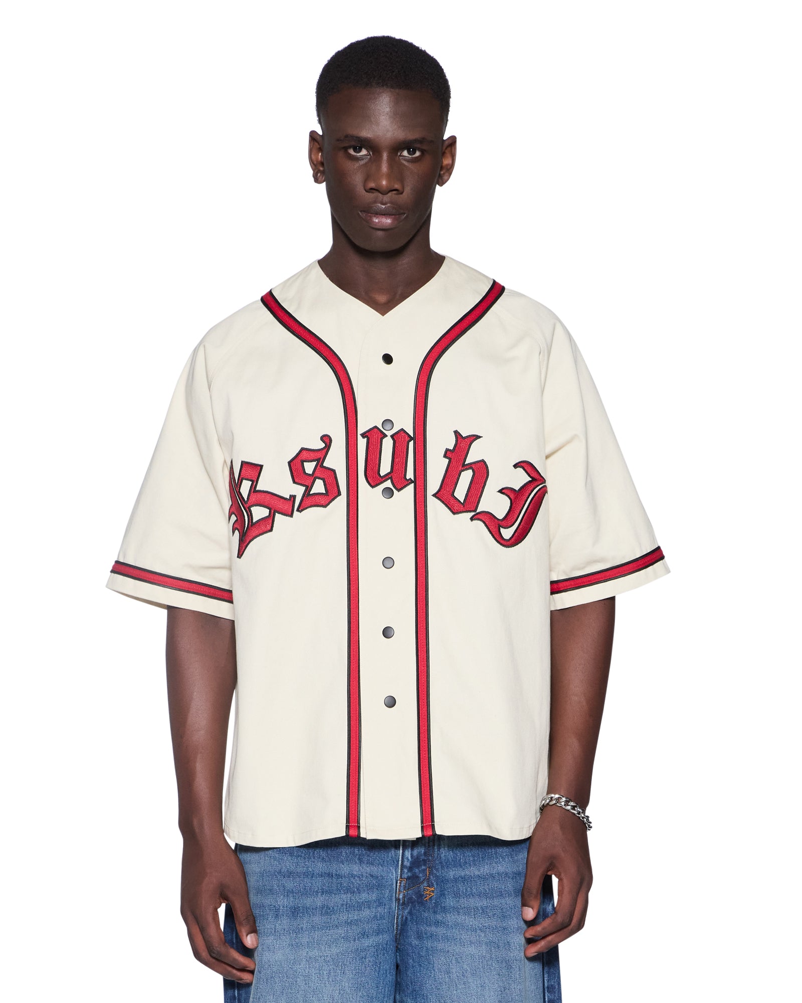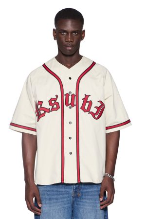 The Kball Baseball Jersey Desert is a boxy oversized fit baseball jersey with traditional baseball jersey construction. dropped raglan sleeves. a press-stud button closure at the front and signature rats tail detail. Constructed with seam piping and panel detailing. it is made from midweight cotton twill in a desert colourway with a soft wash. It features seasonal artworks embroidered across the front and back. finished with signature t-box and 4×4 embroidery branding.
