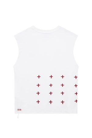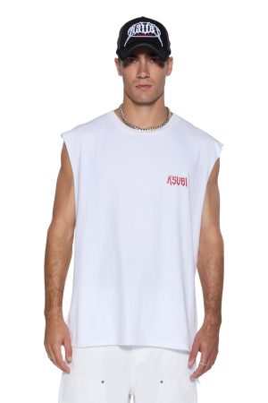 The Kingdom Cut Off Biggie Tee White is a sleeveless. oversized-fit t-shirt with a raw-cut back hem. reverse overlocked side seams. and signature rats tail. Made from premium cotton jersey. garment-dyed deep. it features a seasonal print at the front crest and is finished with signature T-box and 4×4 branding.