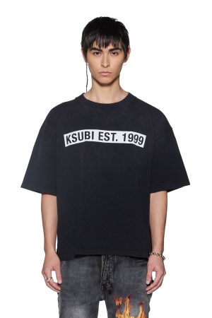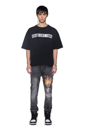 The Kings Sid Ss Tee Black Fade is a boxy oversized fitting. waist-finishing length tee with an exaggerated shoulder drop. reverse overlocked side seam and signature rats tail. Made from heavyweight cotton jersey in a garment dyed faded black with an aged wash. it features screen printed seasonal artwork at the front and back. Finished with signature t-box and 4×4 branding.