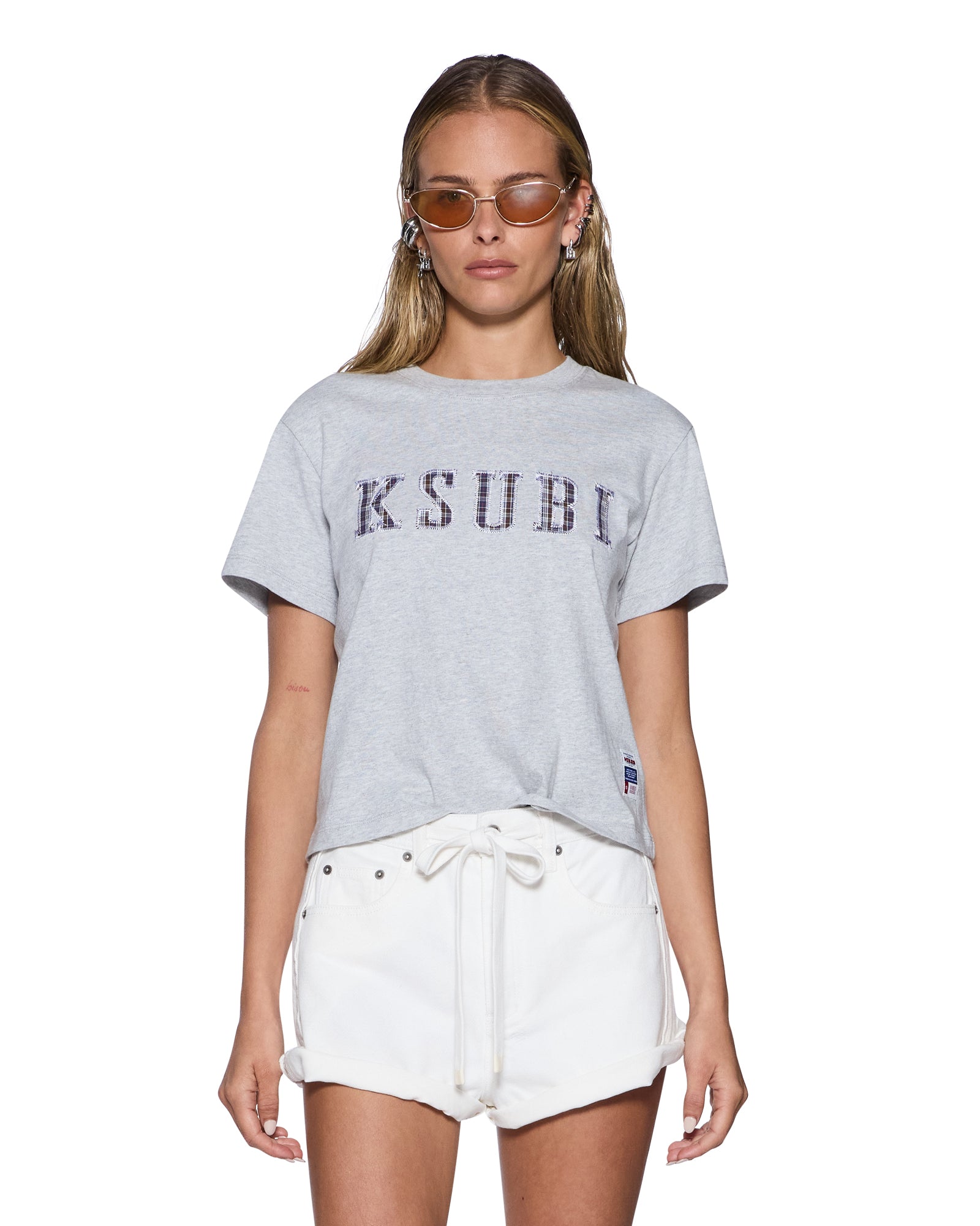 The Ksubi Plaid Shrunken Short Sleeve Tee Grey Marle is a relaxed mini tee with a crew neck. short sleeves. and regular length. Crafted from premium cotton jersey in grey marle. the style features a seasonal Ksubi plaid applique on the front and is finished with signature T-box embroidery. Style back with the Liberty Blue denim story for a complete look.