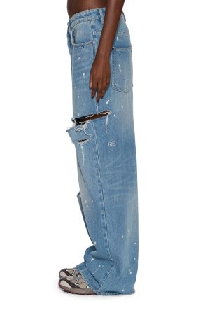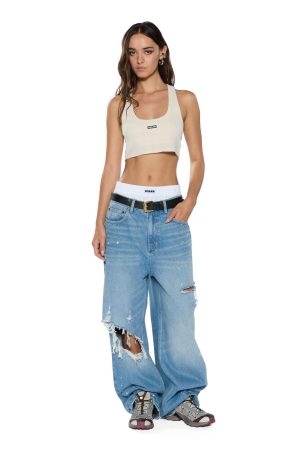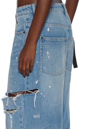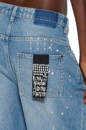 The Ksuper Surge Trashed is our baggiest fit yet. designed with a super oversized. super low-rise silhouette and full length leg. Made from premium rigid denim in a vintage blue wash. it features heavy distressing. decon hit at the knee. hip slice. bleach splatters. five-pocket styling. Ksubi hardware. T-box and 3×4 embroidery. plus a removable pocket tag for a street-style edge.