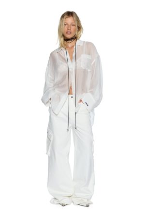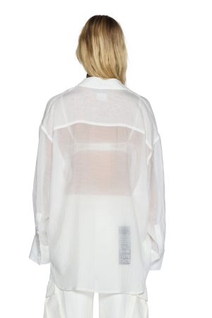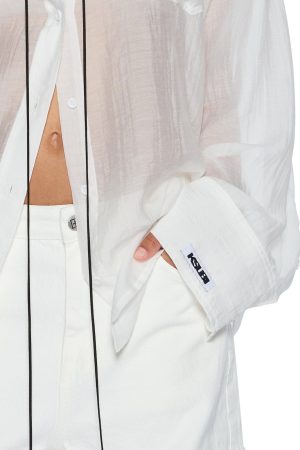 The Labels Astra Ls Shirt Black is an oversized button-up shirt. made from premium tencel blend sheer fabrication in a white colourway. Featuring a patch pocket. curved hem. and classic centre front collar with exaggerated cuffs. Finished with a Ksubi T-box and Cross dollar embroidery. Style back with any Ksubi denim for an off-duty elevated look.