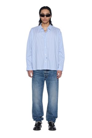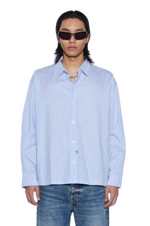 The Lanley LS Shirt Ocean Stripe is a boxy. waist-finishing long sleeve shirt with a front button placket. Cut from patterned cotton poplin. it features the Ksubi State print on the back and is finished with signature T-box and 4×4 branding.