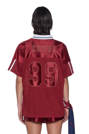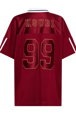 The Double Down Ls Jersey Garnet is an oversized. dropped shoulder sports jersey featuring an all-in-one shoulder yoke detail and a cotton ribbed collar inset into a V-neck. Constructed with contrast fabric sports mesh on the front bodice panel and sleeves. it includes white flat binds on the sleeves. custom collaboration patches with tan zigzag topstitching and dense embroideries. and is finished with a brown PU Ksubi patch on the lower front and signature T-box embroidery.