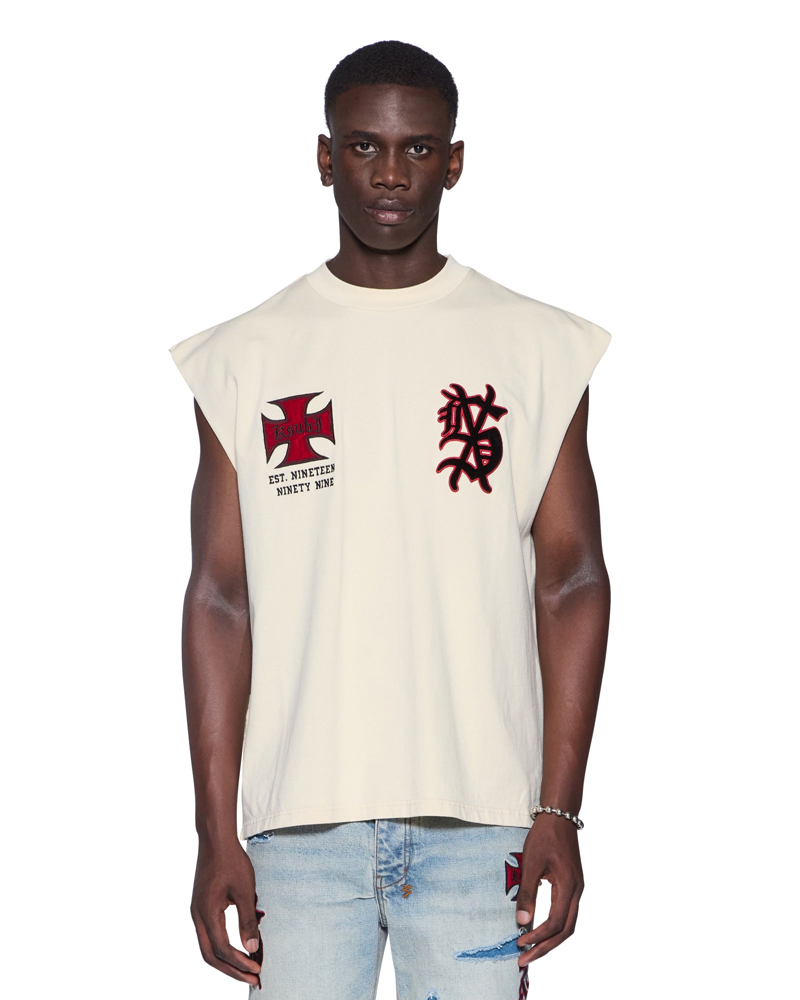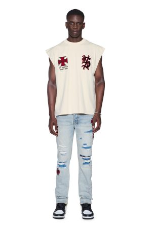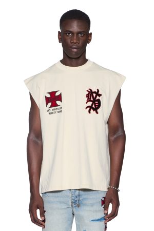 The League Ekcess Cut Off Desert is an oversized fit sleeveless t-shirt with a raw cut back hem. reverse overlocked side seam and signature rats tail. Made from premium cotton jersey in a garment dyed desert colourway. it features seasonal and core artworks embroidered and patched on the front and back. Finished with signature t-box and 4×4 branding.