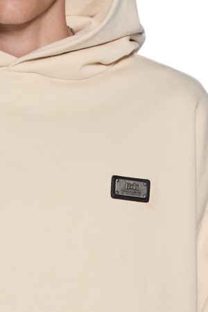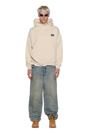 The Lords Ekcess Hoodie Desert is a boxy. oversized-fit hoodie with a single-piece hood. front pouch pocket. and rats tail detail. Made from heavyweight loopback fleece in garment-dyed desert with a slight aged wash. it features a leather-backed metal plate at the chest. finished with T-box and leather-applique 4×4 branding.