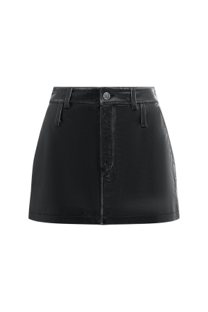 The Low Rider Mini Aged Black redefines edgy sophistication with its low-rise cut and classic five-pocket design. crafted from premium 100% lamb leather. Enhanced with a vintage treatment for an aged look. this skirt features anti-silver branded hardware. an embossed 3×4 T-box. and a distinctive SOTT embossed patch. designed to sit low on the hips.
