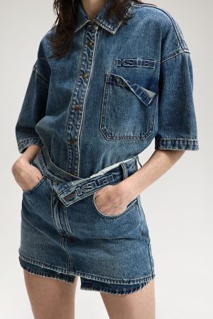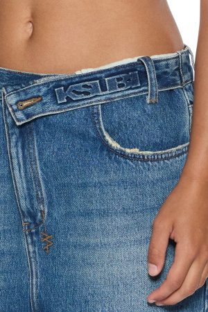 The Low Rider Mini Flip Aged is a low-rise mini skirt with classic five-pocket styling. Made from premium rigid denim in a mid-blue aged wash. it features subtle grinding. a flipped waistband with embossed Ksubi branding. anti-brass hardware. T-box and 3×4 embroidery. and a removable pocket tag at the wearer’s right back pocket.