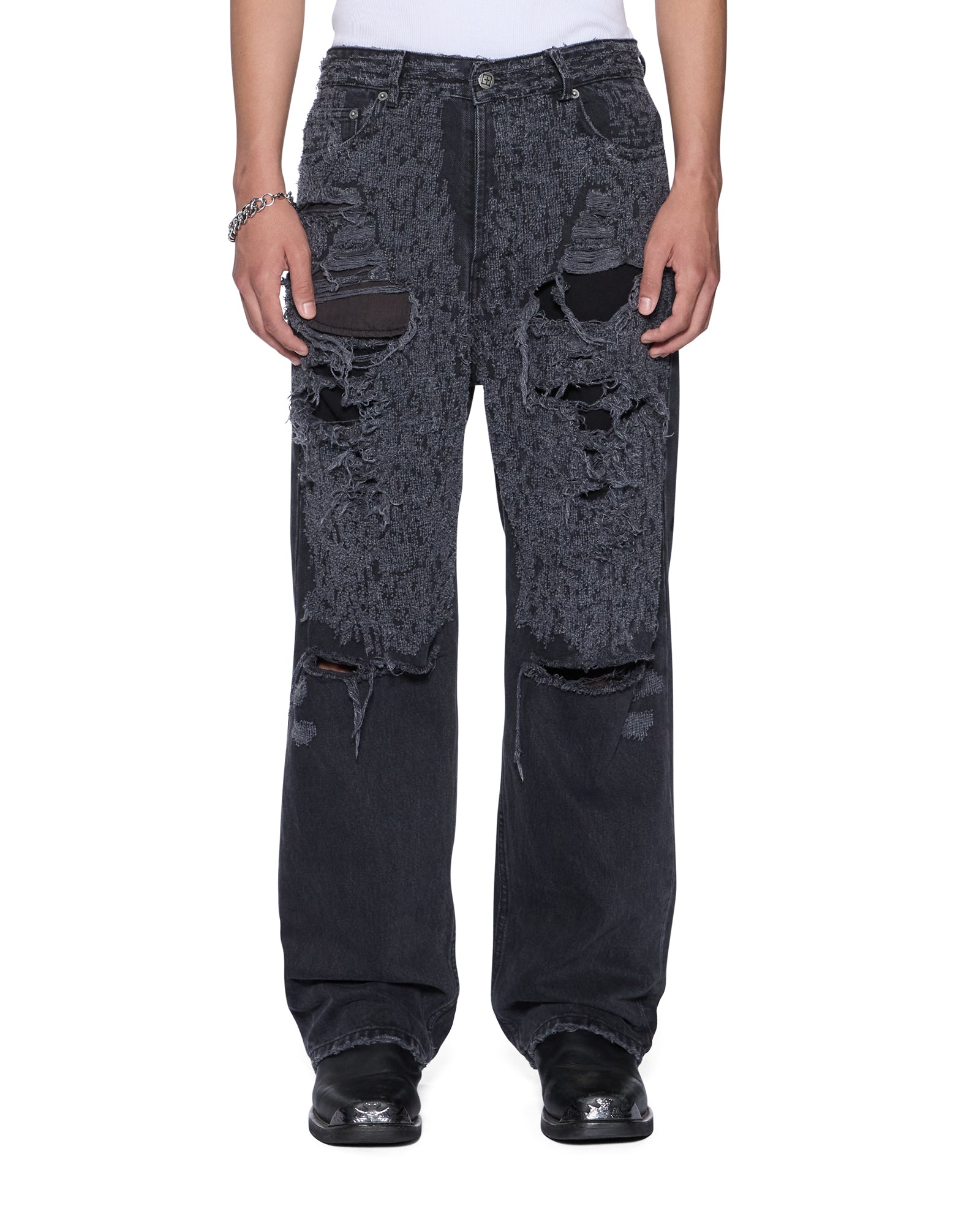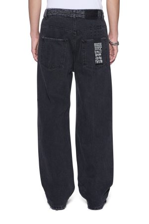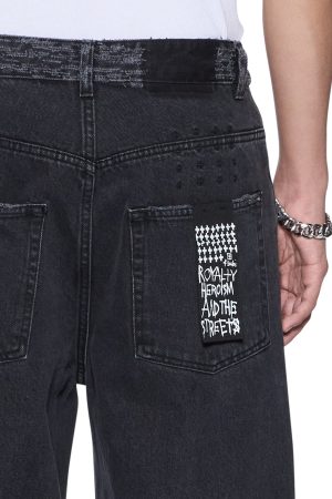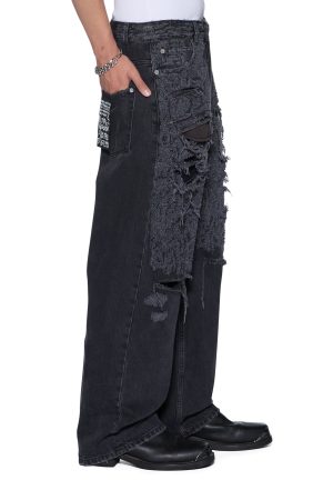 The Maxx Asher Black Trashed is an exaggerated straight-leg jean with a long rise. Made from rigid black denim with a faded stone wash. it is heavily deconstructed with multiple levels of abrasions from the waistband down to the knee. finishing with blown-out knee areas. Finished with signature t-box and 4×4 embroidery and Ksubi branded hardware.