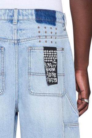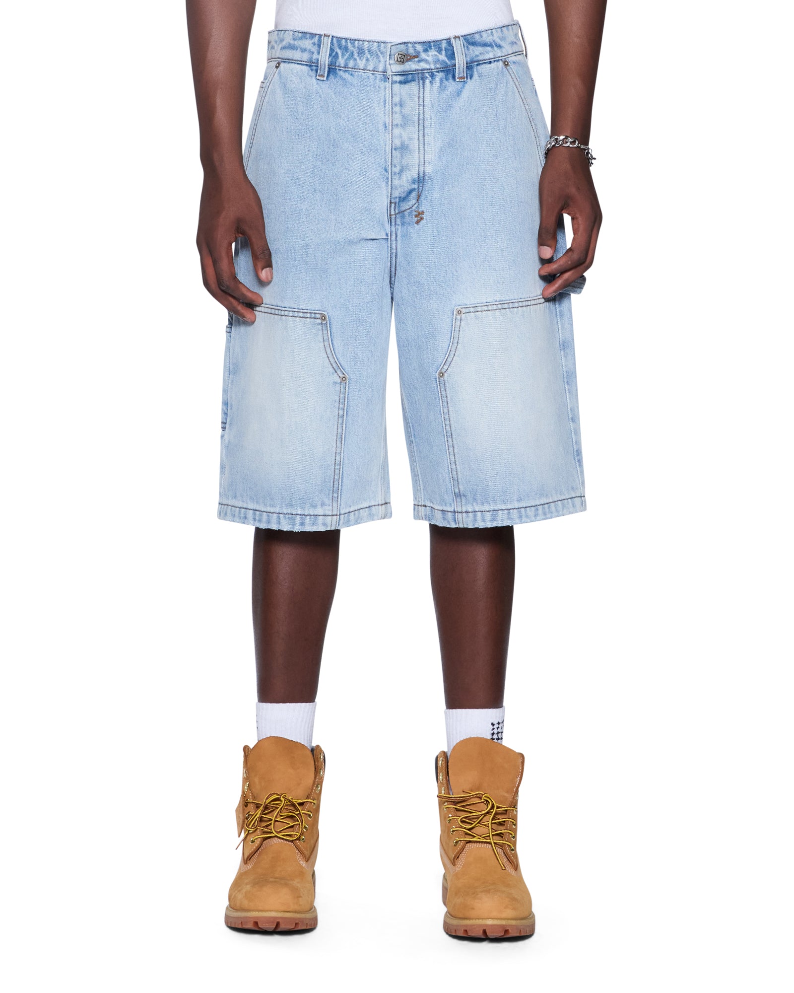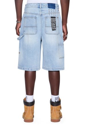 The Maxx Operator Short Kasper Blue is an exaggerated wide-leg jean short designed with a long rise and crafted from premium rigid indigo denim with a light blue stone wash finish. The style features carpenter panels. a right leg carpenter pocket tab. cut-away front pockets. back patch pockets. and signature t-box and 4×4 embroidery with Ksubi branded hardware for a bold utilitarian aesthetic.