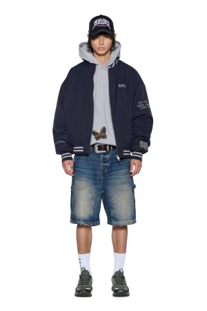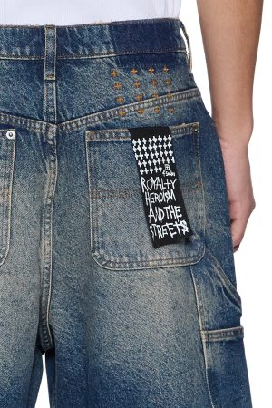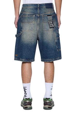 The Maxx Operator Short Rodeo Blue is an exaggerated wide leg denim short with a long rise. featuring carpenter panels. a right leg carpenter�s pocket tab. cutaway pockets. and back patch pockets. Made from premium indigo denim with a heavy tinted stone wash. it is finished with signature T-box and 4×4 embroidery and Ksubi branded hardware.