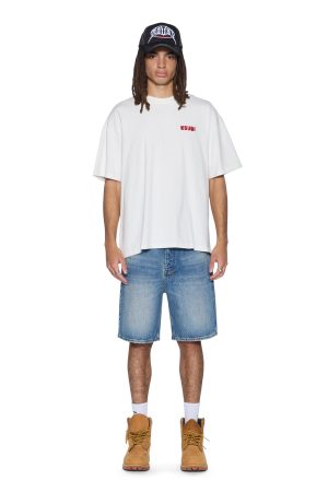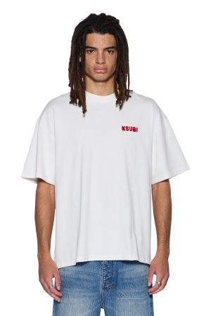 The Mekanik Biggie SS Tee Vintage White is a boxy. short-sleeve t-shirt with dropped shoulders and a raw-cut back hem. It features reversed overlocked side seams. Ksubi’s signature rats tail. and branded logos. Crafted from premium cotton jersey in a vintage white colorway. it showcases seasonal chainstitched artwork on both the front and back. Finished with signature T-box and 4×4 embroidery branding.