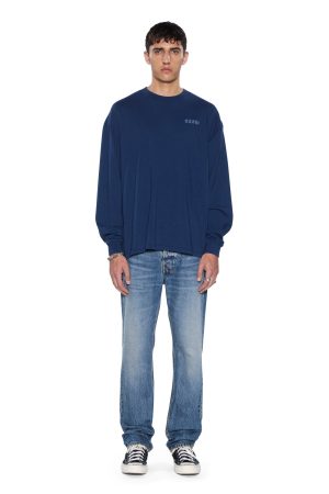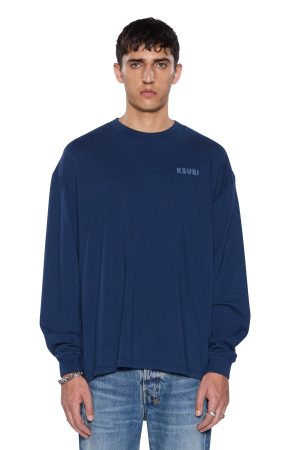 The Mekanik Ekcess LS Tee Navy is a boxy. long-sleeve t-shirt with dropped shoulders and a raw-cut back hem. It features reversed overlocked side seams. Ksubi’s signature rats tail. and branded logos. Crafted from premium cotton jersey in a navy colorway. it showcases seasonal chainstitched artwork on both the front and back. Finished with signature T-box and 4×4 embroidery branding.