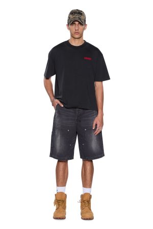 The Mekanik Halen SS Tee Charcoal/Red. is a short-sleeve t-shirt with dropped shoulders and a raw-cut back hem. It features reversed overlocked side seams. Ksubi’s signature rats tail. and branded logos. Crafted from premium cotton jersey in washed black. it showcases seasonal chainstitched artwork on both the front and back. Finished with signature T-box and 4×4 embroidery branding.