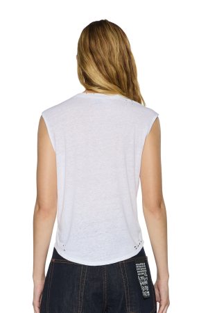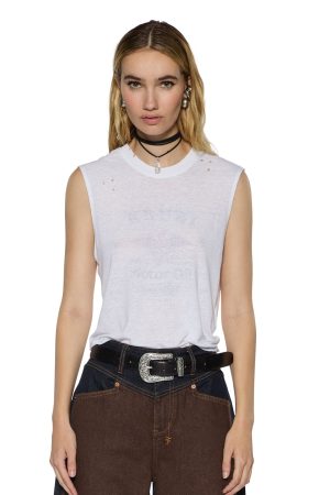 The Motor Oil Moss Tank White is a slim muscle tank silhouette with a crew neck and high hip length. Featuring a curved hem and is crafted from semi-sheer slub jersey in white. The seasonal exclusive Ksubi ‘Motor Oil’ graphic is printed on the inside for a diffused. vintage look. Subtle knicking throughout adds a worn-in feel. and the design is finished with signature T-box embroidery.