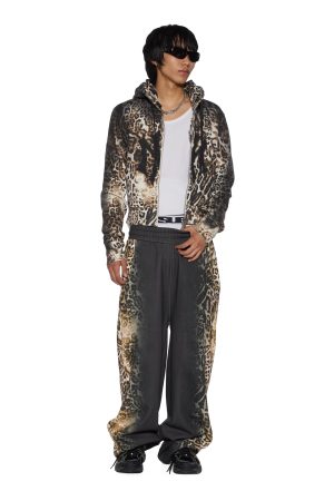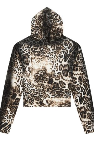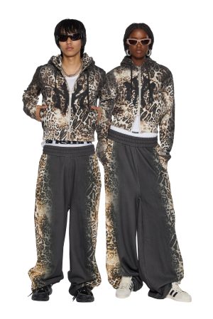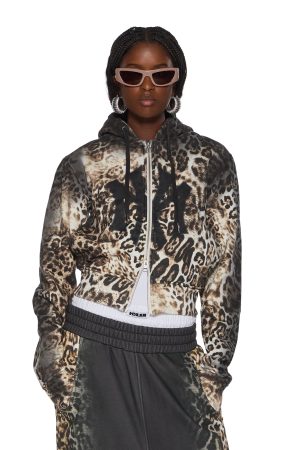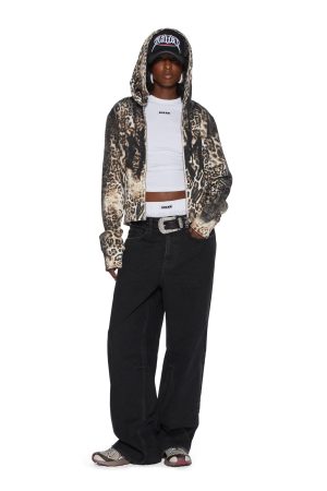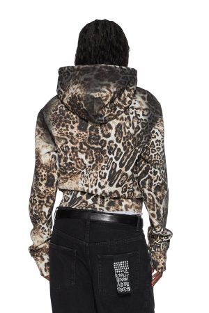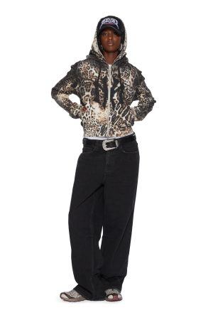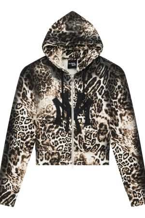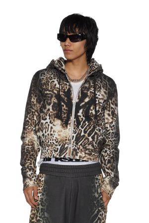 TheMowalola Zip Hoodie Cheetah is a boxy. boyfriend-fit zip-through hoodie with a dropped shoulder and long sleeves. Designed with a double-layer hood that can be styled uniquely. it features an open-ended double carriage zip. ribbed cuffs and hem band. and side seam pockets. Crafted from premium brushed-back cotton fleece. it showcases an exclusive cheetah print with black spray detailing along the seams. Finished with signature T-box embroidery on the back and a special collaboration swingtag for a bold Mowalola edge.