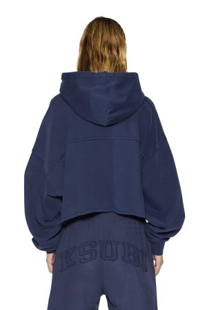The Oh G Hoodie Cropped Ink Blue is an oversized fit hoodie with dropped shoulder. long sleeve. and cropped length. Featuring rib cuffs and raw edge yoke seam detail. it includes an exclusive Ksubi ’99’ ghost patch and embroidered outline on the front. Made from premium loopback cotton fleece in ‘Ink Blue’ colourway. it features a Ksubi ‘SOTT’ label on the wearers left sleeve and T-box embroidery on the back.