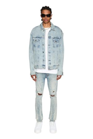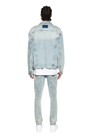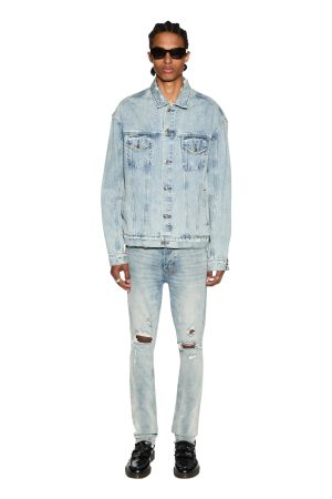 The Oh G Jacket is an oversized trucker fit denim jacket featured in a vintage stonewashed blue colourway. This style is constructed from a heavy duty rigid 100% cotton denim . detailed with heavy trashing and deconstruction. This style also features a button through front. Ksubi branded hardware and 4 pockets.