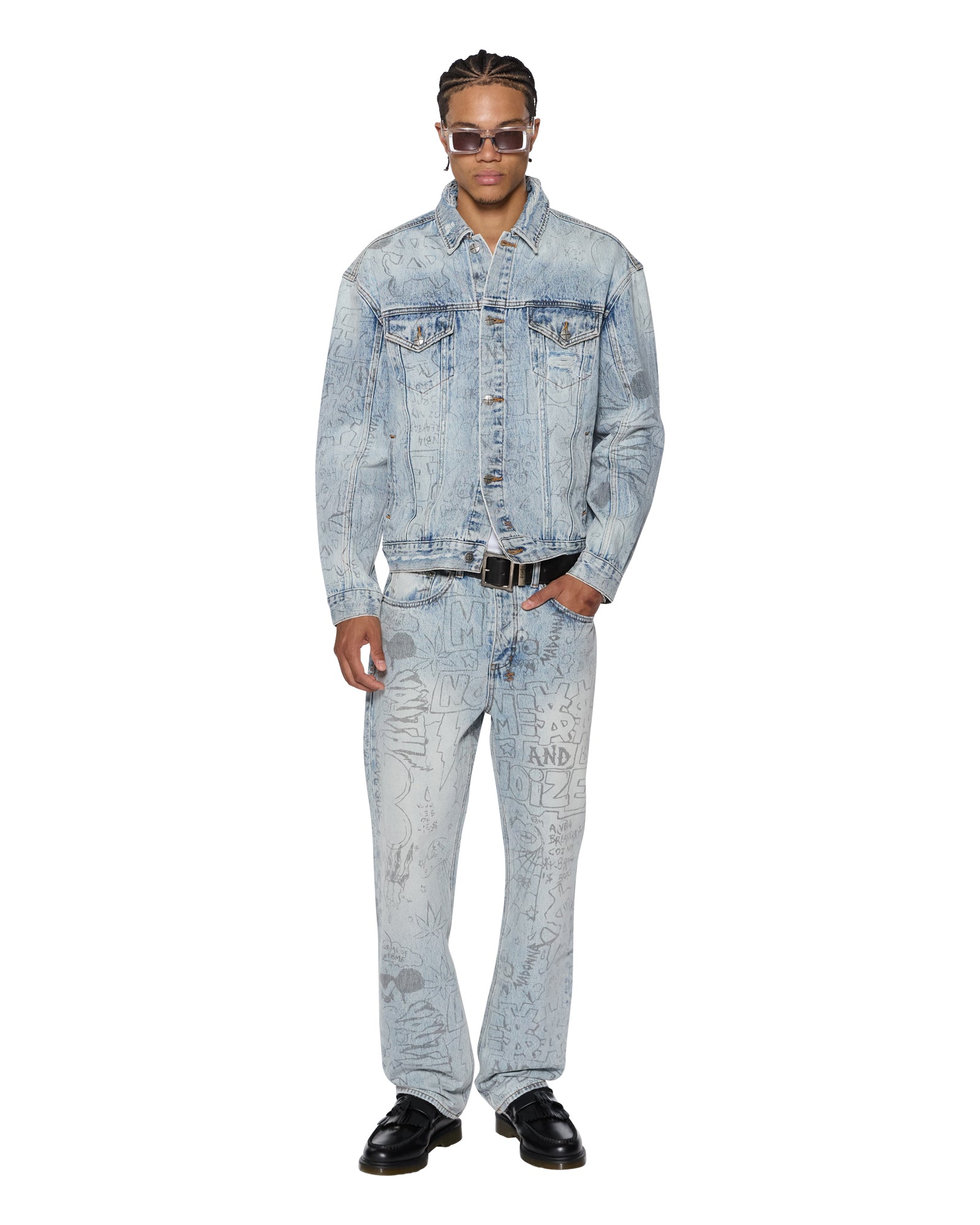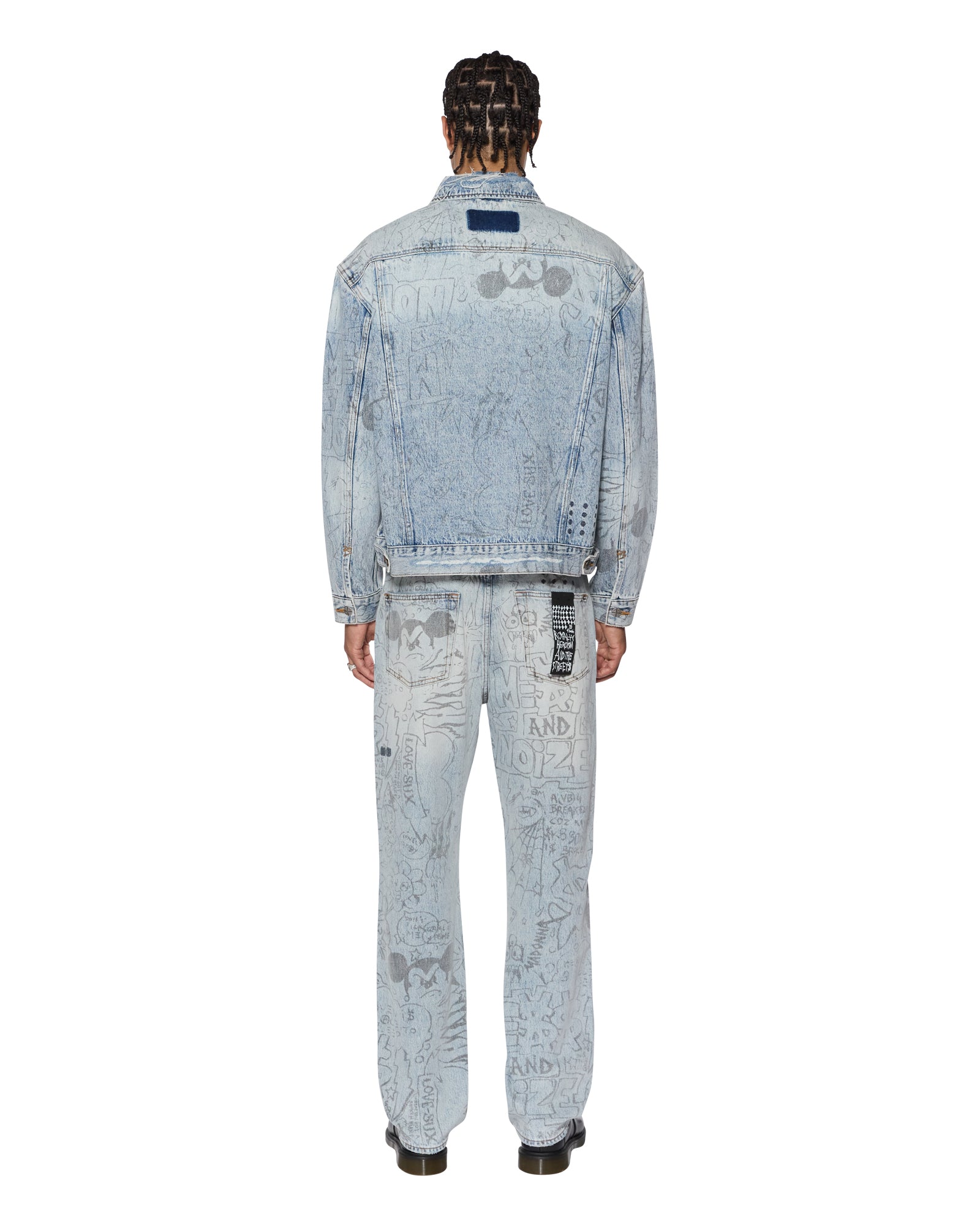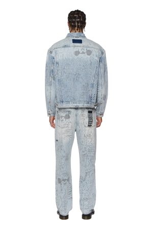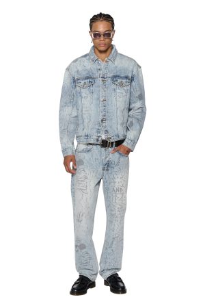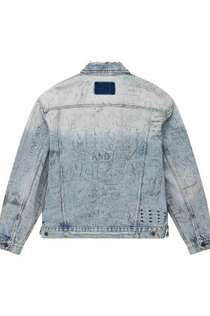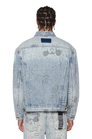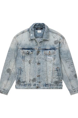 The Oh G Jacket Bunker Blue Noize is an oversized fit trucker jacket. Made from premium rigid denim with a heavy stone wash and light contrasting details. it features traditional denim trucker construction and panelling. The jacket also includes a seasonal artwork printed all over the garment in a repeat pattern. Finished with T-box and 4×4 embroidery branding and Ksubi branded hardware.